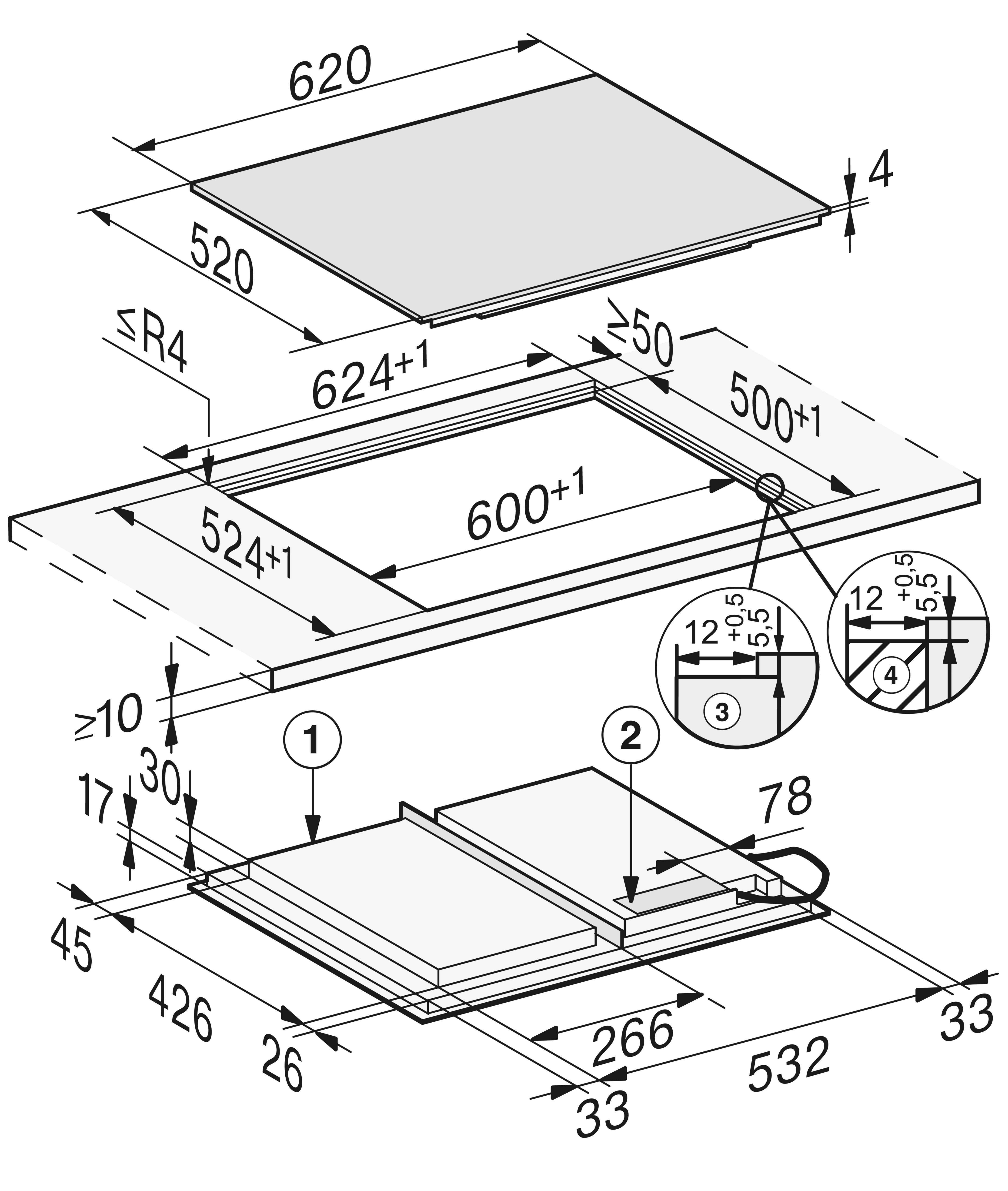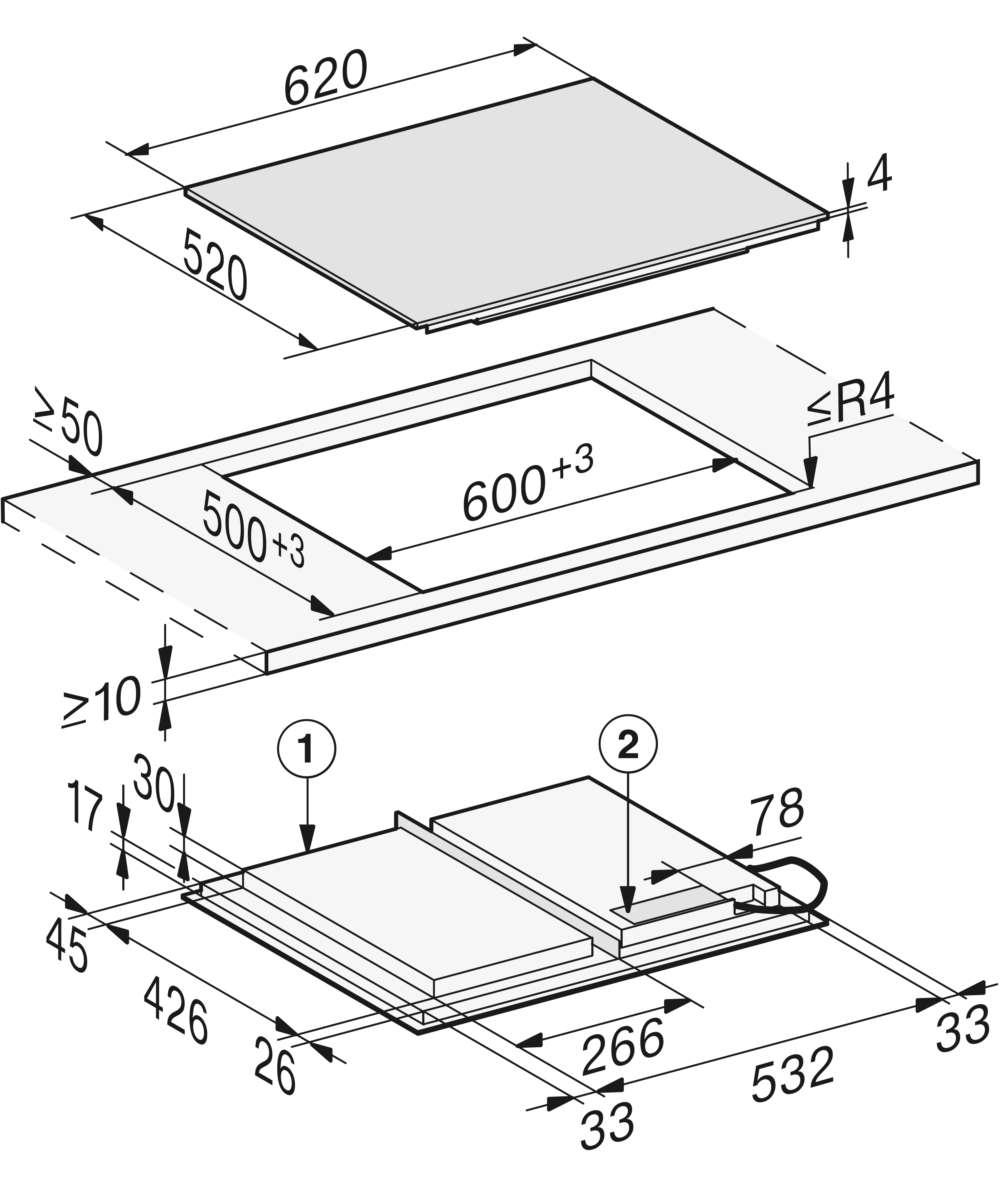 Размер ниши(Ш x Г): 600 х 500 (при монтаже сверху)или 600/624 x 500/524 (вырез ступенькой для монтажа заподлицо) мм