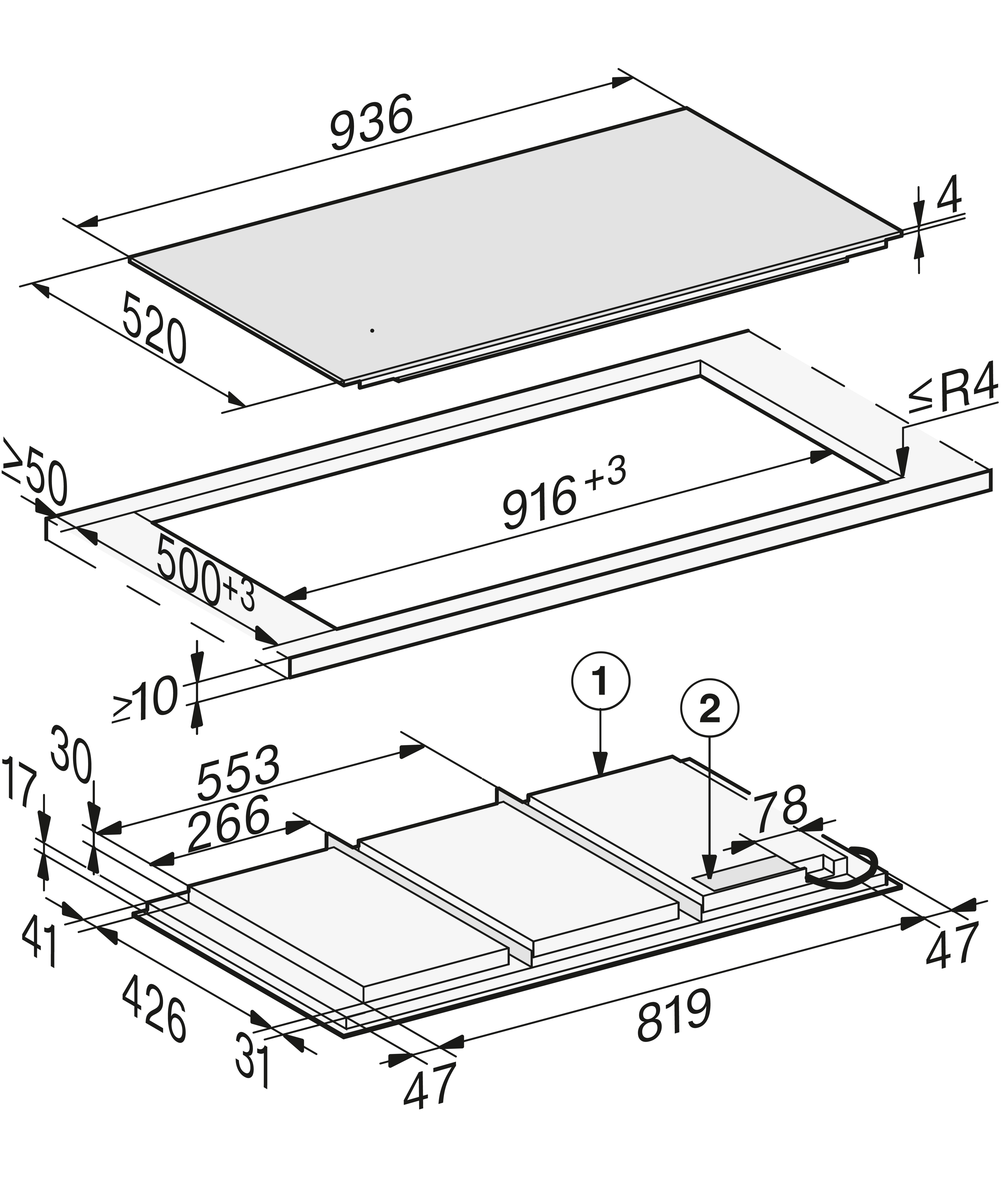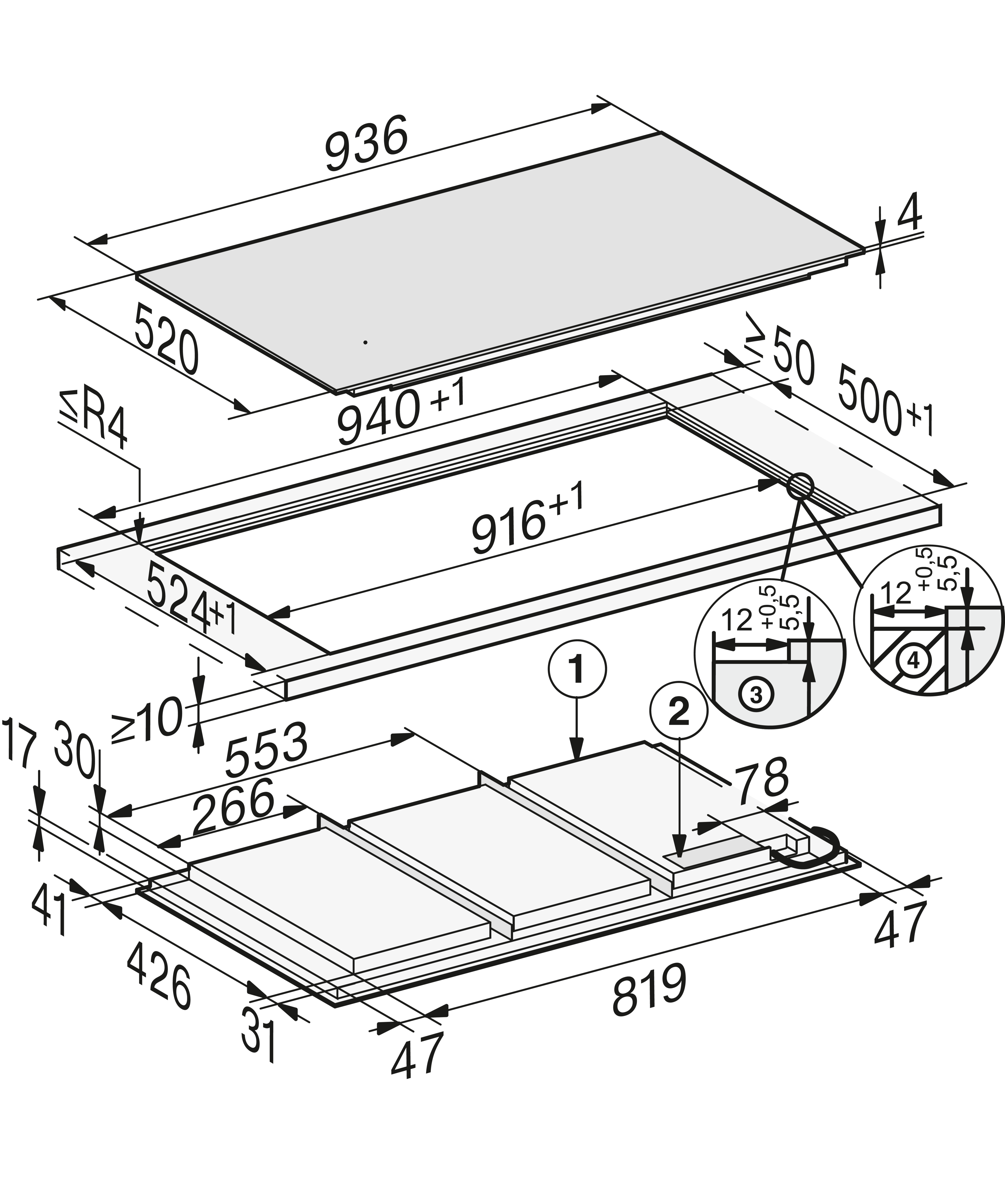 Размер ниши(Ш x Г):916 х 500 (при монтаже сверху) или 916/940 х 500/524 (вырез ступенькой для монтажа заподлицо) мм